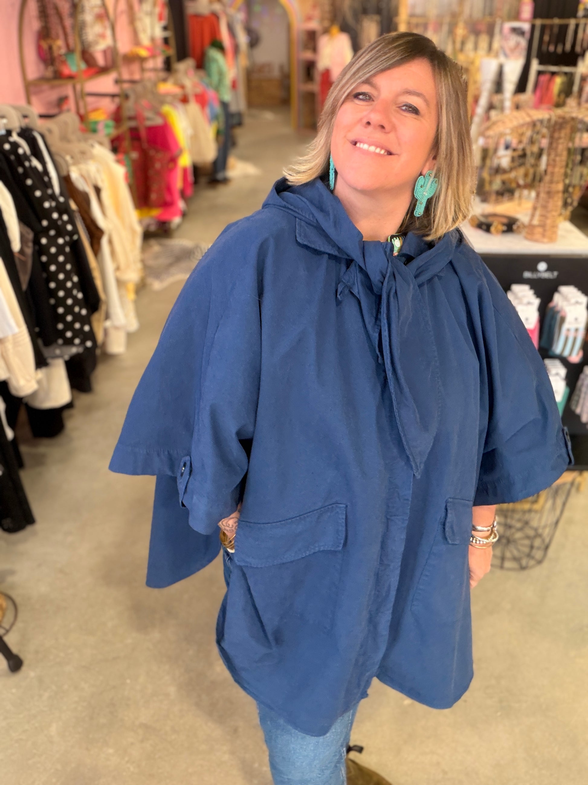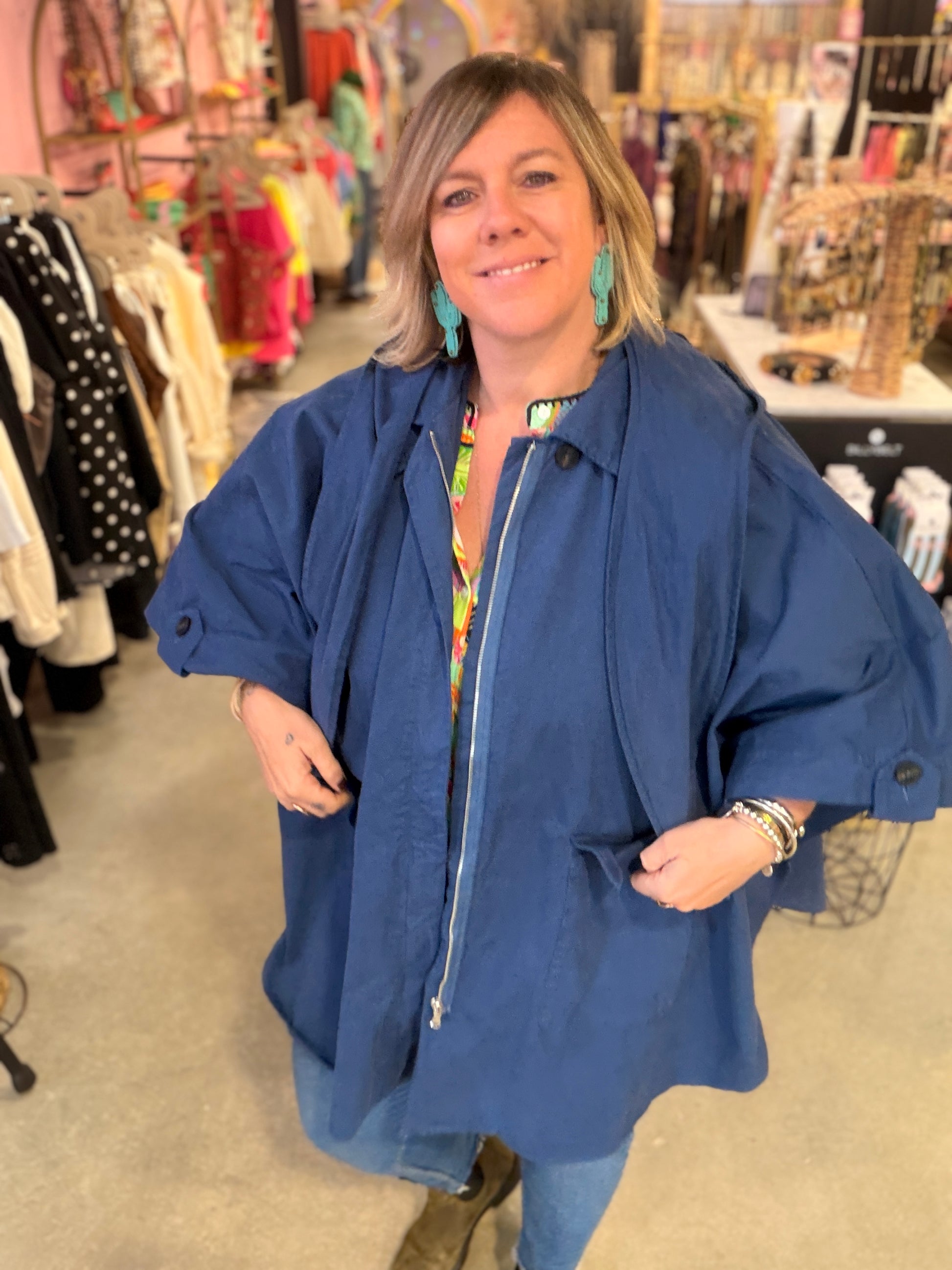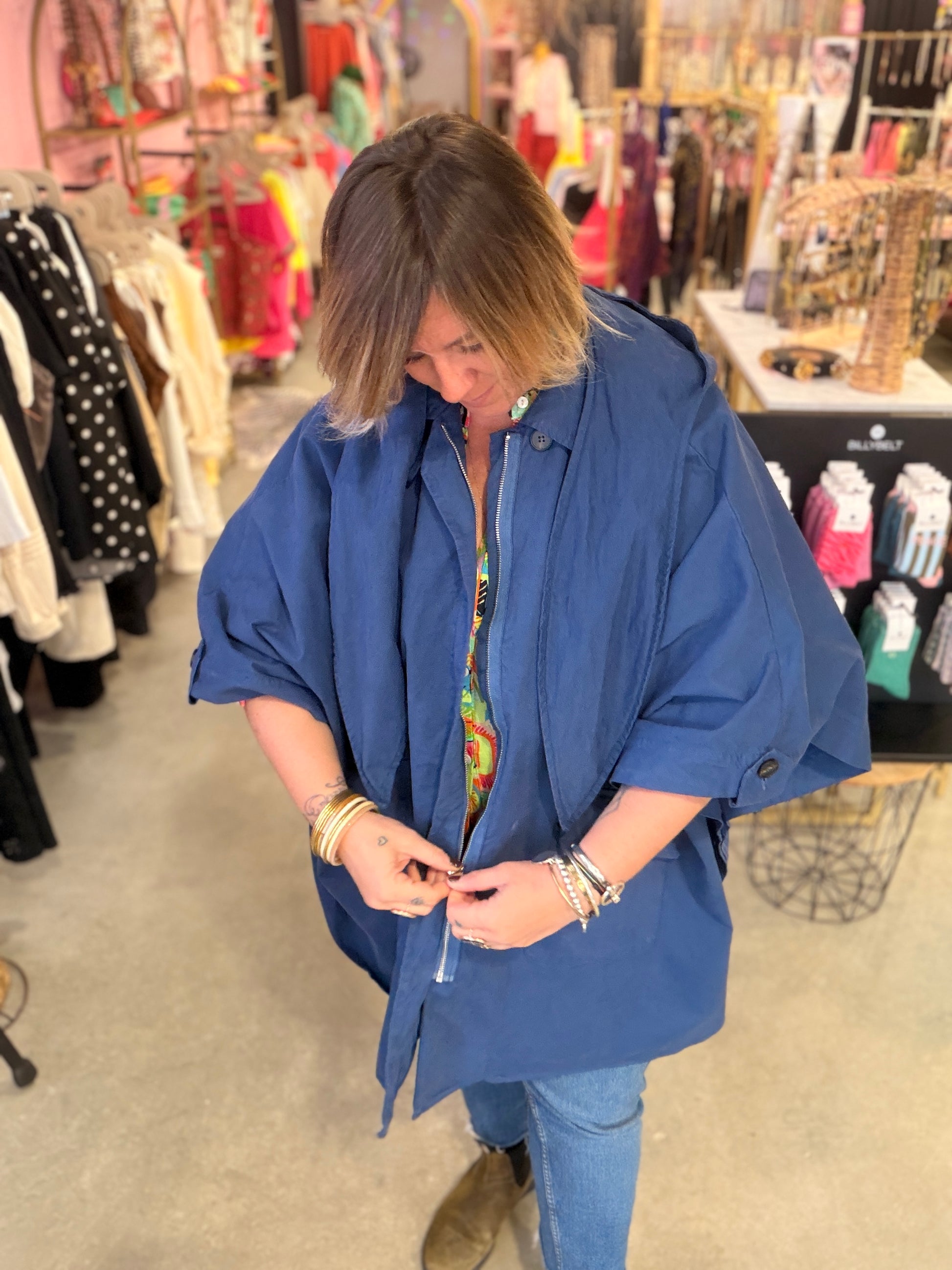 La Cape Antonella, dans son coloré marine profond, apporte ce petit supplément d'âme et de mystère à toutes vos tenues!