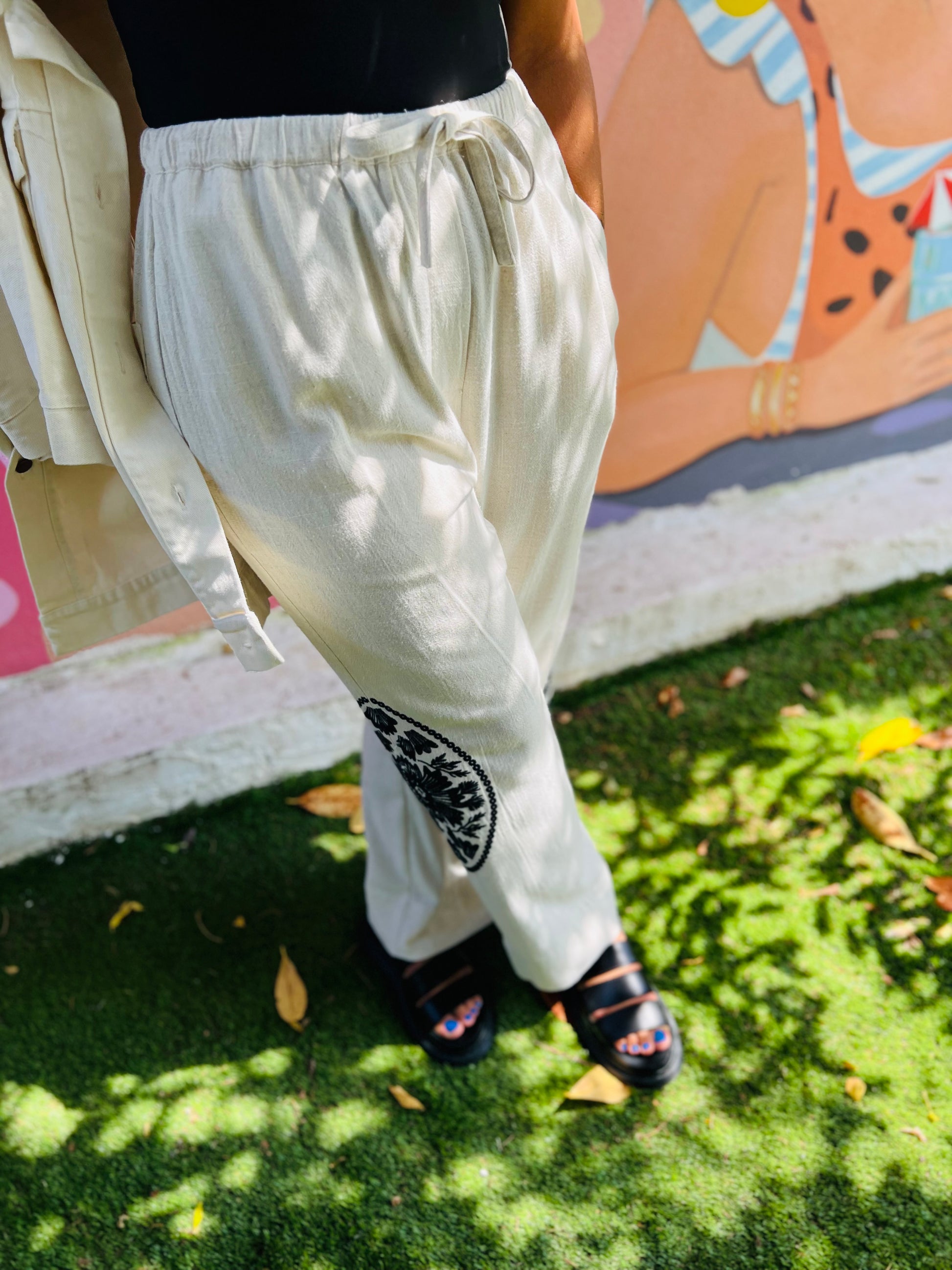 Le parfait pantalon, fluide et vaporeux, avec sa broderie noire à la jambe pour un effet waouh!