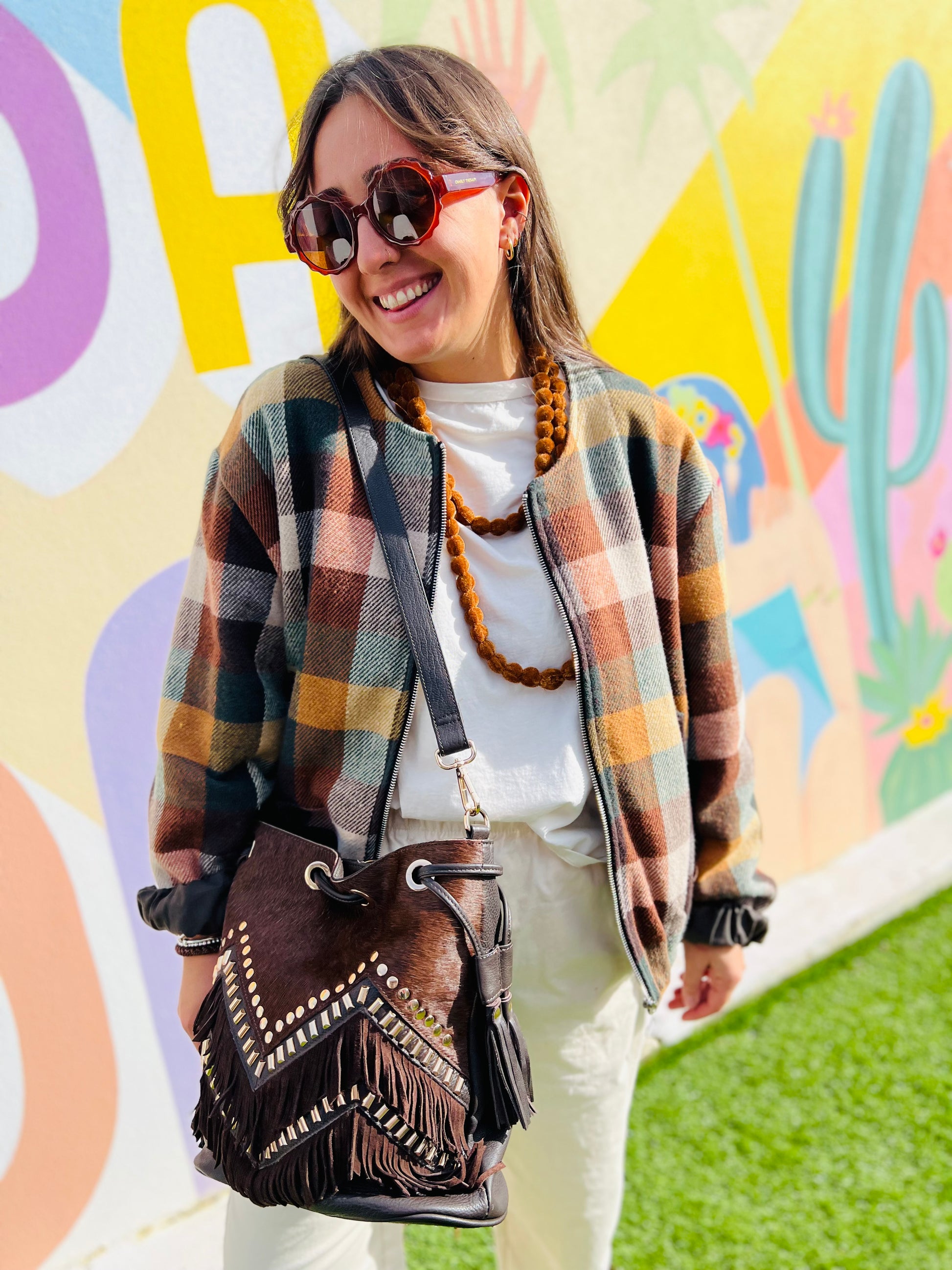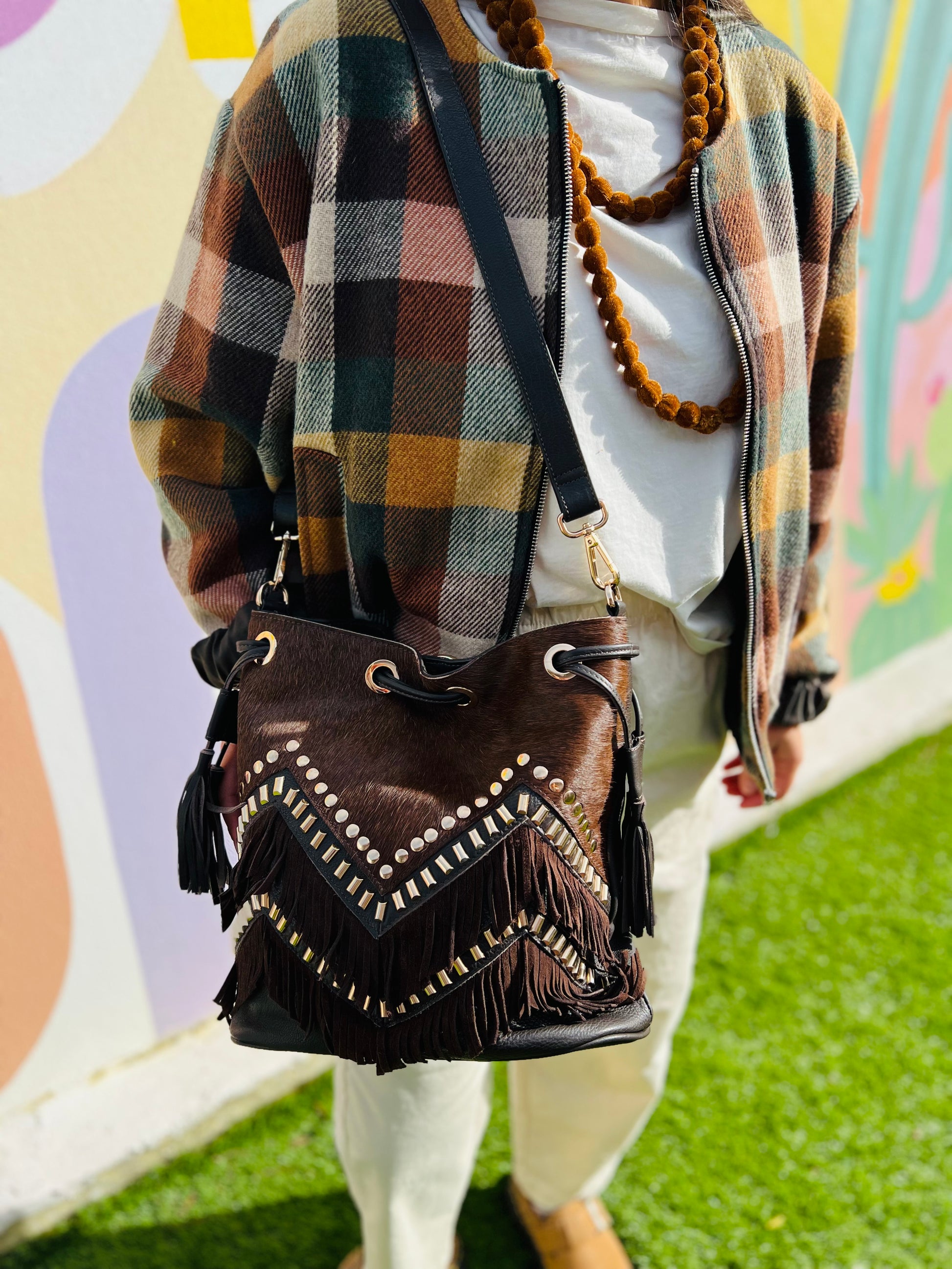 En forme de bourse, poil ras, clous et franges sur le devant, elle est tout cuir à l'arrière