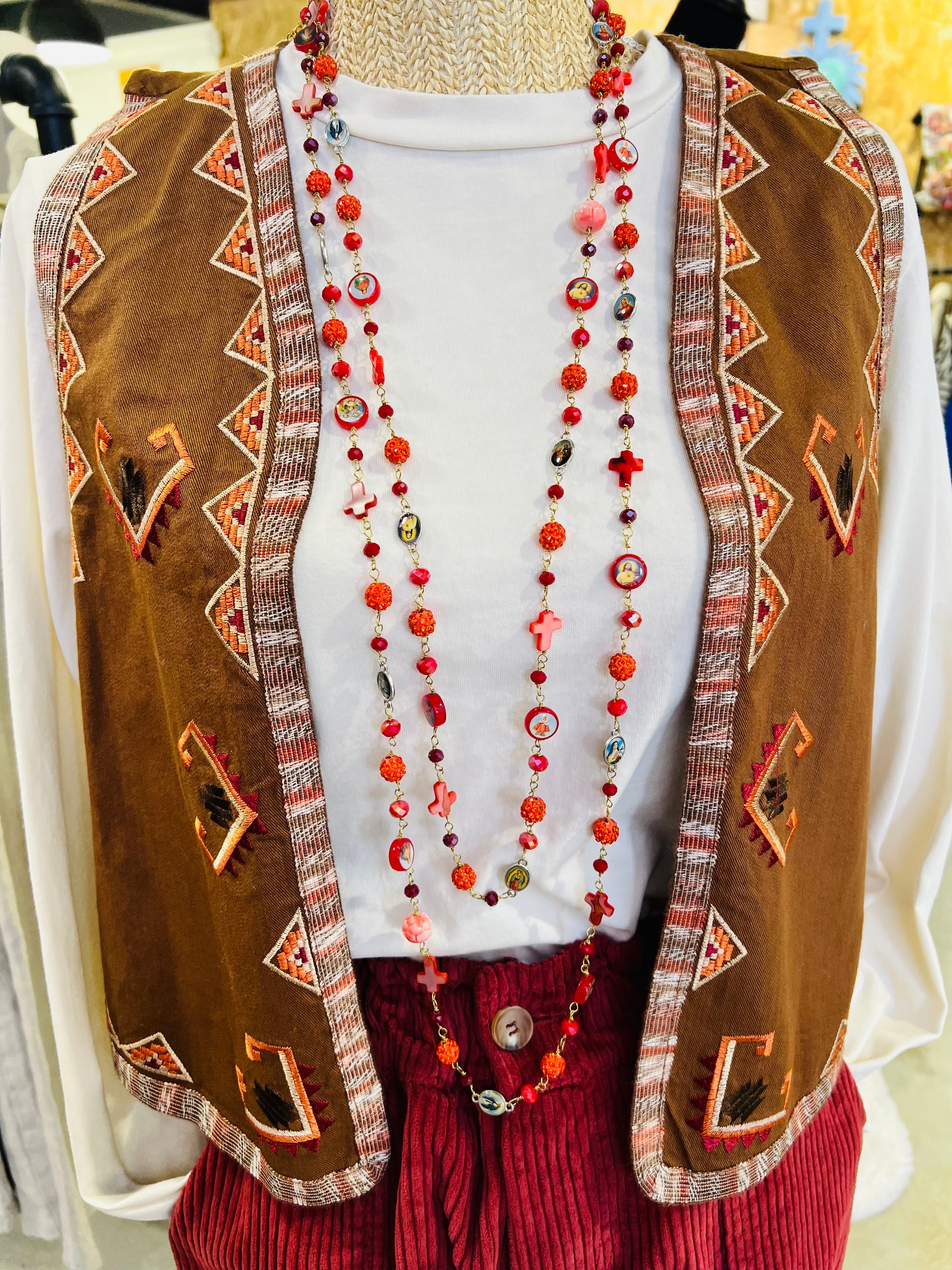 La symbiose entre les ornements religieux et la beauté des perles offre un équilibre parfait entre spiritualité et élégance. La longueur généreuse permet divers styles de port, adaptant ce sautoir à toutes occasions.