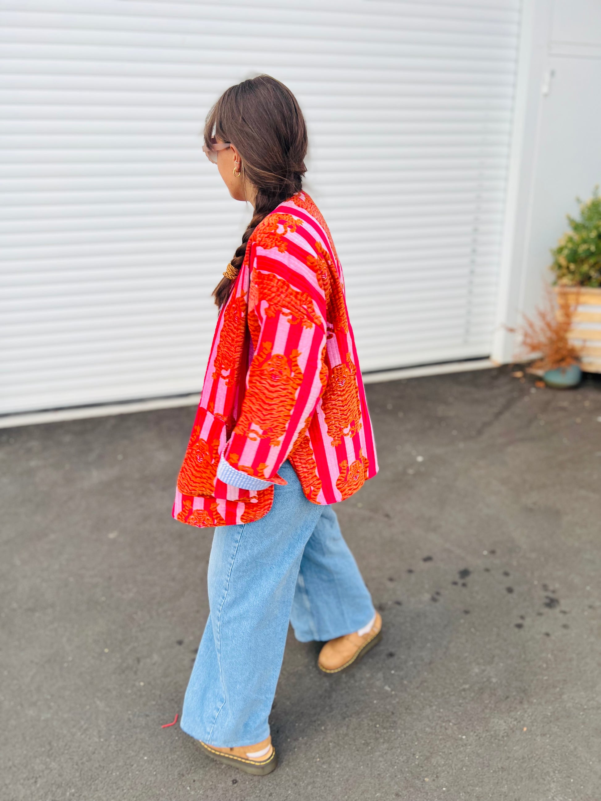 La veste matelassée façon velours tout doux, poches plaquées devant et revers rayé...On fond littéralement!!!